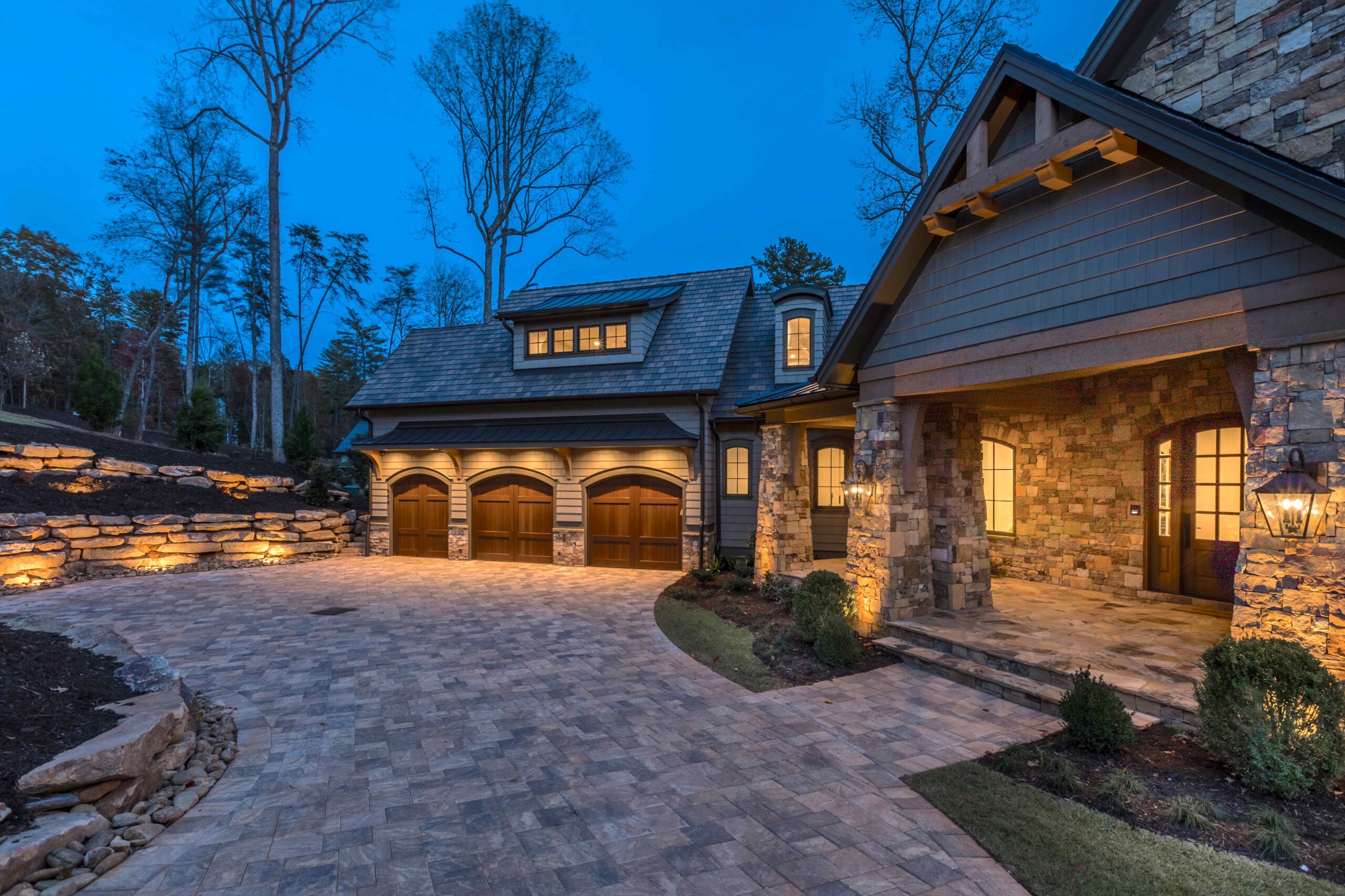 This 5,500-square-foot lake and mountain home is specifically designed to capture amazing views while offering comfortable modern living. The 5-bedroom plan offers an optional Study on the main level and pocket slider doors from the vaulted Great Room to the covered porches. One bedroom is a private guest suite over the garage. The terrace level contains two large bedrooms, a gorgeous bunkroom that sleeps 4 to 6, and a large recreation room with walk-behind bar facing a large stone fireplace.
